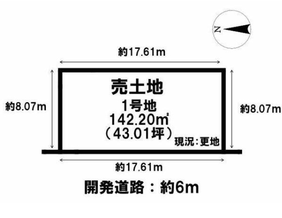 【1号地】3区画の分譲地、八木西口駅より徒歩約26分、土地面積43.01坪、整形地、建築条件なし