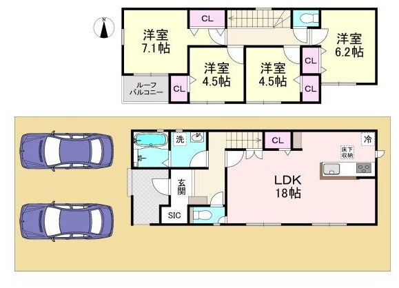 | 間取内容 | 1階LDK18.0畳1室 2階洋室7.1畳1室 2階洋室6.2畳1室 2階洋室4.5畳2室